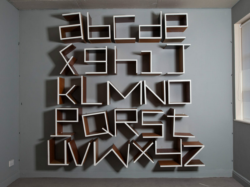 The Alphabet is made from a system of wooden panels taken from discarded desks, shelves and other pieces of furniture. Each letter is then dipped in white gloss paint to emphasze the letter. Each letter is designed and made to be freestanding hence some strange letterforms F and P especially. As shelves, the storage is arranged alphabetically, scissors go on the letter S, your Wham LP on the W and so on. It has been exhibited freestanding in Milan, London, Sydney, Melbourne and Athens.
