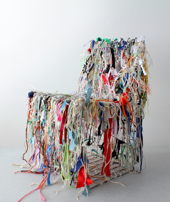 This chair has no name. It was made by 1500 participants using their own pieces of string, ribbon or cord in order to re-imagine what upholstery could be like. I designed and supplied the frame. You can read more information about this project on my blog HERE and HERE and you can see a short video of it HERE and new blog post HERE